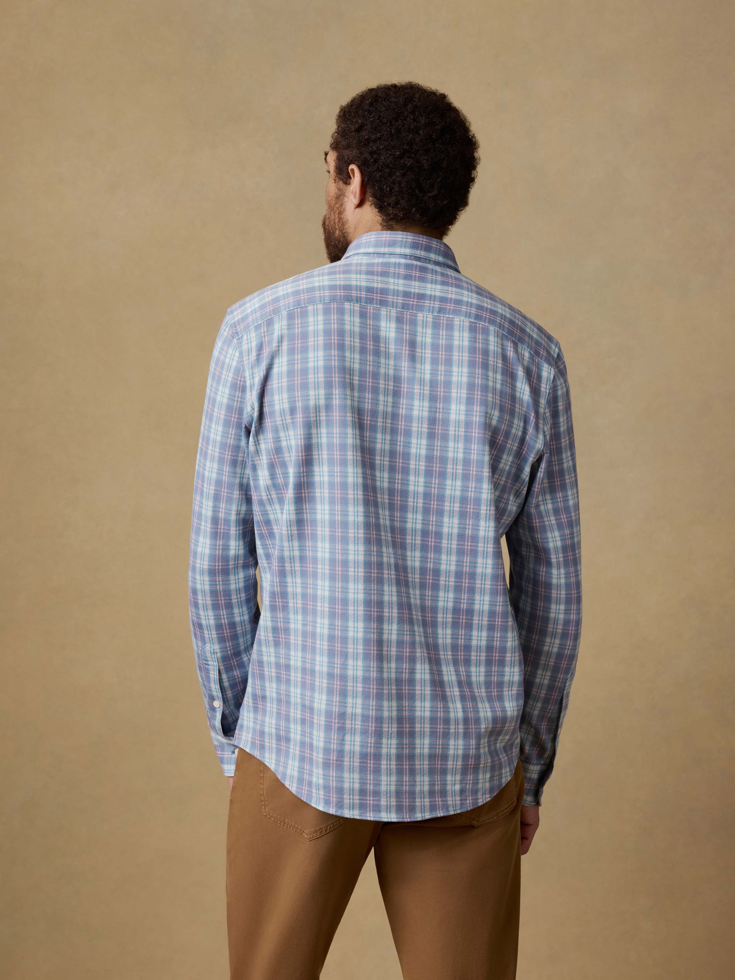 - Detail: Button-down collar. Button front and cuffs. Patch pocket. Shirttail hem.